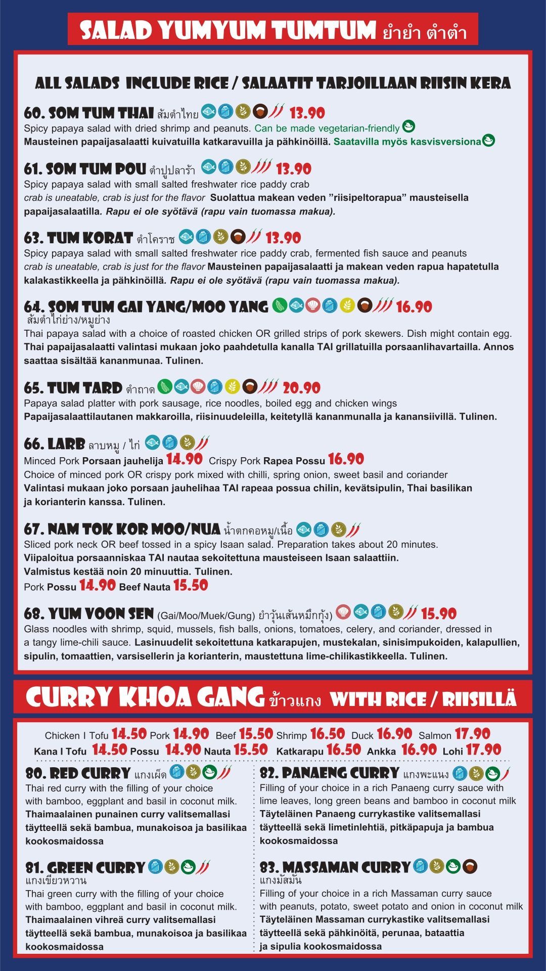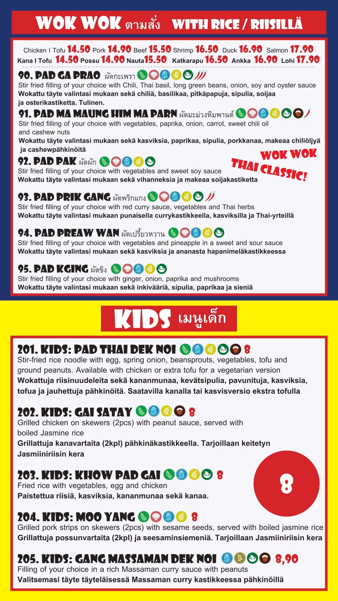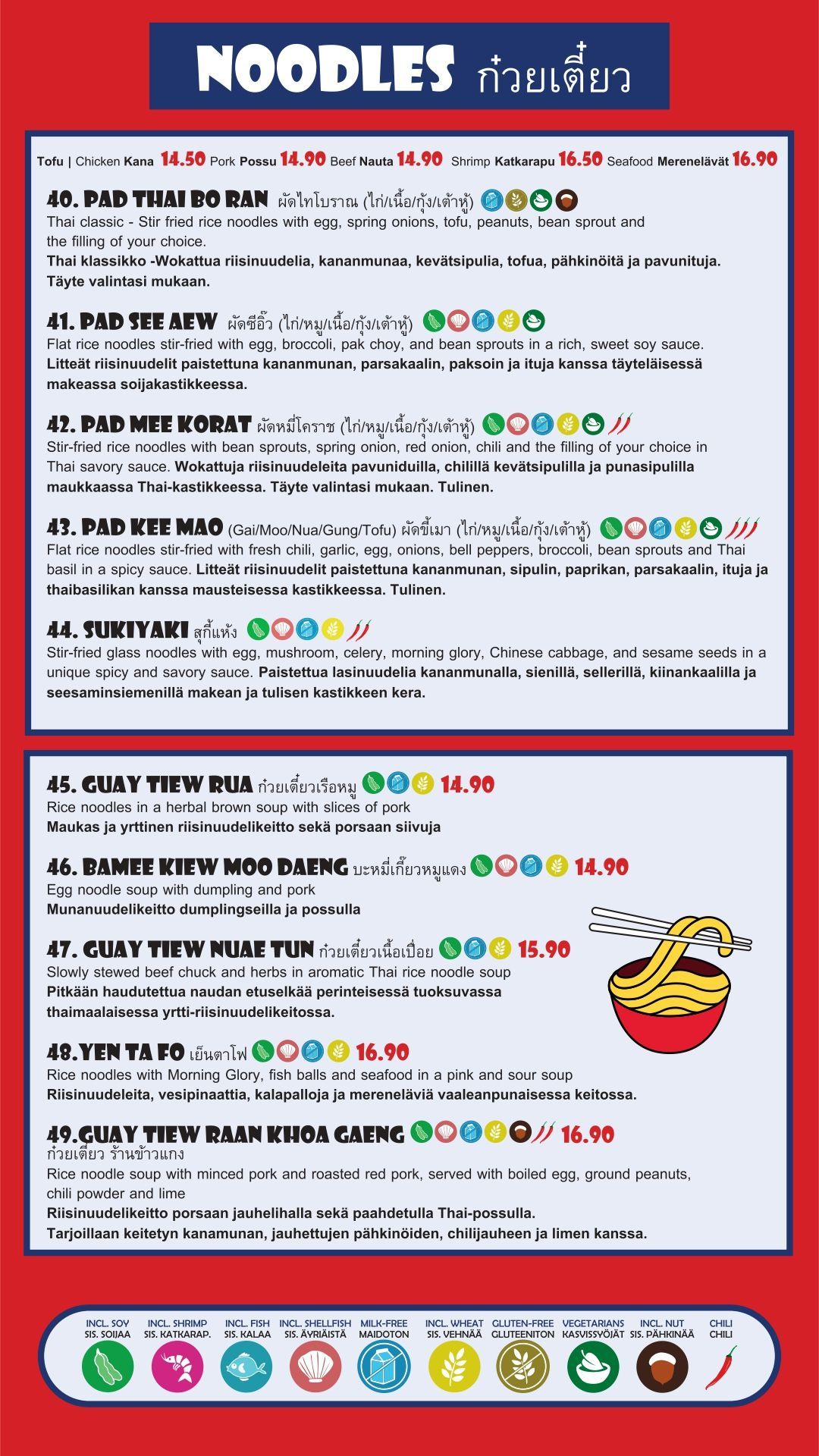 Monipuolinen menumme sisältää vaihtoehtoja niin pieneen kuin suureenkin nälkään. Meiltä saat muun muassa edulliset kevätrullat, maukkaat tom yam -keitot, monipuoliset pad thai -nuudeliateriat ja paljon muuta. Tutustu menuumme ja tule käymään paikan päällä!